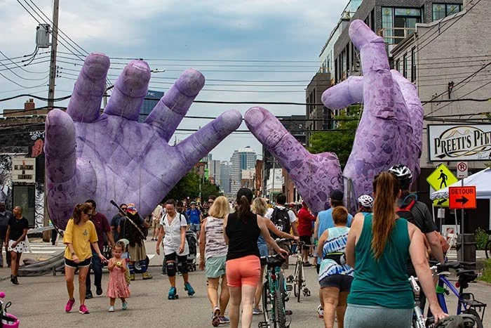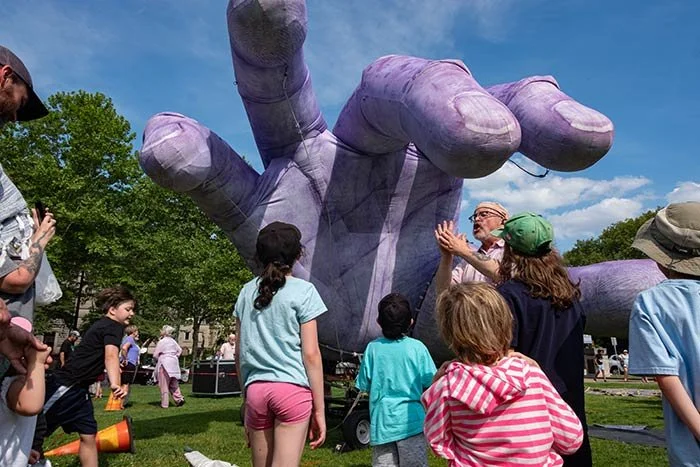 Squonk’s original progressive rock drives a journey that is spectacular, plaintive, and comic. In this melee, the giant thumbs detach to become truly opposable and challenge each other with guitars. Audience members come together to grab the rigging, each individual powering a larger movement of giant fingers, a web of connections, a single dance. We want to encourage shared discovery, people face to face, festive, and making a community of the imagination. Hand to Hand.